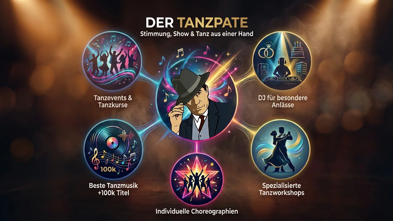 Als dein Tanzpate vereine ich beide Welten in einem All-in-One Paket. Ich bringe die Erfahrung eines Turniertänzers, die Didaktik eines Tanzlehrers und das Gespür eines Profi-DJs mit an den Regler.